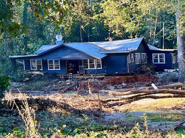 Harmon Field on the other side of us was completely flooded and now a big mud pit. It is closed along with both roads on either side of our road that go up into the mountain town of Saluda. The 1930 bridge before Pearson Falls is now gone. Houses were taken off their foundations. I talked to one man living there who said eight died on that road and they may never open that road again because of the huge boulders that came down. Caro-Mi, a restaurant that has been there since 1945 is now gone. I have photos of all these places around me on my instagram page for the farmhouse. All the places that would be an attraction for our airbnb now gone. They say it will take two years to open Pearson Falls. The caretaker tried for three hours to get to the falls and couldn't because of downed trees and boulders.